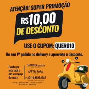 PROMOÇÃO PRORROGADA no delivery próprio do Tia Zarica. Use o cupom QUERO10 e ganhe R$ 10,00 de desconto no primeiro ou próximo pedido (válido uma vez por cadastro). Entre em “delivery” (acima) ou no botão abaixo (“peça já”).